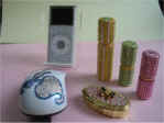 こちらは、奥にあるiPodは直接に装飾を施したもので、3本並んだものはアトマイザー(香水入れ)です。
