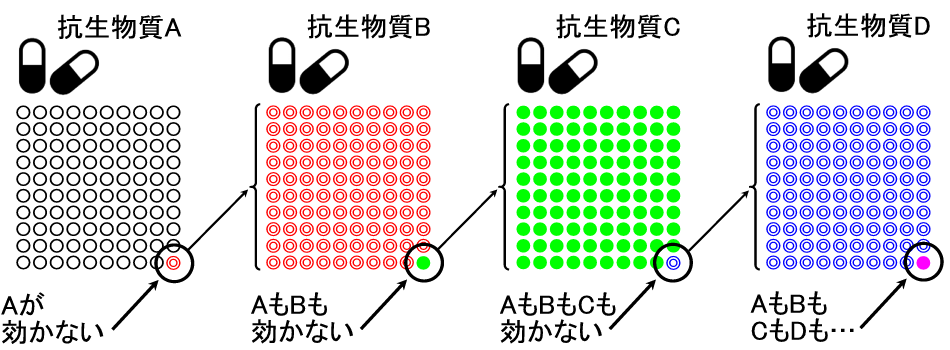 多剤耐性アシネトバクターって?帝京大学医学部附属病院(帝京大学病院)で9月3日に「複数の抗生物質が効かない多剤耐性のアシネトバクター菌(MRAB)に入院患者ら46人が感染していた」と発表されました。 さらにそのうちの27人が死亡し、9人は感染と死亡との因果関係が疑われるということで、現在も捜査中ということです。 最初は「多剤耐性アシネトバクター菌」という一つの言葉と思っていたのですが、「多剤耐性」と「アシネトバクター菌」という2つの言葉の組み合わせだったと分かりました。 アシネトバクター菌というのは、自然環境の中に普通に存在している細菌で、川の近くなど湿潤な環境を好むそうです。 そして、人の皮膚や動物の排泄物などにもいることがある、他の細菌と同じように比較的日常的にいると思っていいものだと言えます。 アシネトバクター菌がする悪さ…この菌に感染しやすいのは、呼吸器系に多く、気管切開の手術などで感染し易いのですが、可能性としては全ての臓器で化膿性感染症を引き起こすことがあるそうです。 しかしこれらは、局所的な治療や抗生物質の投与で治ることが多く、そういう傷口にあっても何の症状も起こさない事もあります。 ですから、普通の状態であるならば、常に死の危険を考えていないとならないような菌ではないのですが、甘く見てはいけないのは、特に(手術後などで)免疫力の低下した患者では、髄膜炎や菌血症・敗血症を起こし命の危険にさらされることもありということです。 もうひとつ厄介なのは、この菌は自分のDNAに他のDNA断片を組み込む性質を持つ事から、変異を起こしやすい菌だということです。 つまりこのことが、抗生物質が効かない性質を作りやすい原因になると言えます。 これが今回の「多剤耐性」と言う言葉と結びついてくることになります。 抗生物質に対しての「多剤耐性」ここに100個の、ある細菌があったとします。 この細菌を殺すためにAという抗生物質を投与した時に、90いくつかは殺せても、残りのいくつかはこのAという抗生物質に対しての耐性をもってしまいます(抗生物質が効かない状態)。 そこでこのAが効かない、耐性をもった細菌を100個とした時に、これに向けてBという抗生物質を作っても、また90いくつかには効いても残りには効かないという耐性を持ってしまいます。 このイタチゴッコを繰り返すと、抗生物質のAもBも(そしてCもDも)効かないという、多くの薬剤に対して耐性のある細菌が出来てしまいます。 これを「多剤耐性菌」といいます。 今回はこの「多剤耐性」をもった「アシネトバクター菌」が問題となっているわけですが、多剤耐性をもつのはアシネトバクター菌だけではなく、他の変異を起こしやすい細菌もあるわけなので、今後も出現してくる可能性は否定できません。 【例として分かりやすい数字を用いたもので、実際の数値ではありません】