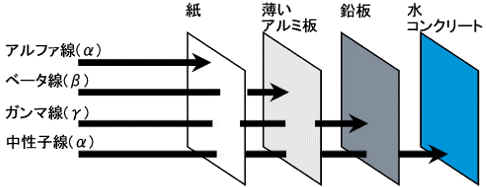 放射線にはアルファ(α)線、ベータ(β)線、ガンマ(γ)線などがあり、それぞれ物質を突き抜ける能力(透過力)が違います。