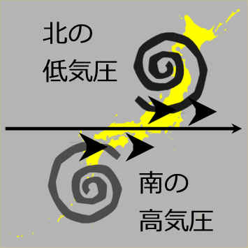ですから、北の低気圧と南の高気圧がぶつかるところでは、図の中の渦に描いた矢印の方向に、低気圧では風を巻き込み、高気圧では風を吐き出しているのです。
