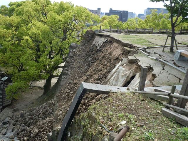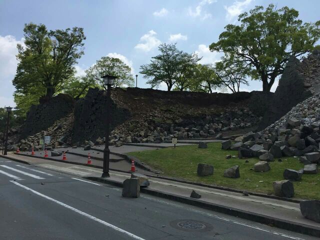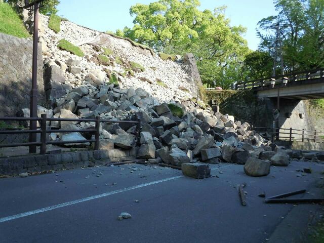 道路などは比較的被害はないようですが、お城の石垣は道路にまで転がり落ちていて、重い石をどけるには重機を使う必要もあるでしょうから、なかなかすぐに出来る事とは思えません。