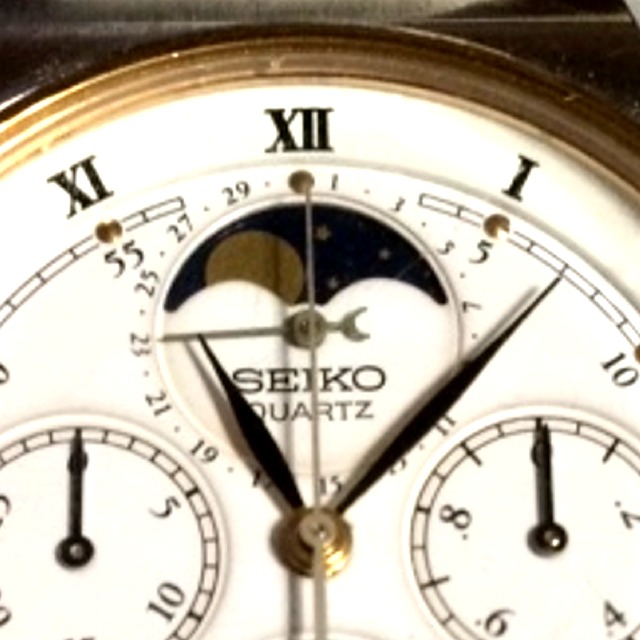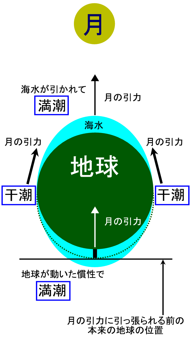 ところが「真ん丸のお月様だねぇ」ということで、満月=真円=お月見の日になるかというと、実は必ずしも一致してきません。 それは、新月から満月を経て新月に戻るまでの満ち欠けに、29.53日かかっているからです。 この「29.53(29.5)」という数字は月齢とも言われており、毎日の正午の月齢が新聞の地方版ページの天気の下に出ています。 そして満月の日の月齢は13.8〜15.8日になるのですが、厳密には月齢14とも月齢15とも言えない微妙なズレが生じてくるからです。 写真はムーンフェイスの時計ですが、新聞の月齢を見てそれに合わせておくと、だいたいの月の形になります。 この時計(機能)の本来の目的は、月齢から様々な情報を知ること、たとえば潮の満ち干が重要な情報となる船乗りやマリンレジャーには、実は欠かせない機能だと言えます。 月の不思議「月の満ち欠けに29.5日かかるなら、月の公転周期(地球の周りを一周する期間)も29.5日なんだなぁ」と思ったら、これは実は2.2日短い「27.32日(27.3日)」でした。 その理由の説明の前には、月の自転周期(月が一回転する時間)を知る必要があります。 月は、地球に対して常に同じ面を向けています。 いつみても月の表面に見える模様(日本では「ウサギ」にたとえられる形です)が、同じに見えることは誰もが知っています。 ですから、月は地球の周りを一周するのに、ちょうど自分でも一回転していることになりますから、自転周期=公転周期の27.3日になるわけです。それでは、なぜ公転周期の27.3日と満ち欠けにかかる29.5日という差ができてしまうのでしょう? (ちなみに満ち欠けにかかる期間のことを「朔望周期(さくぼうしゅうき)」といいます) そっか、地球も動いてたっけまさしくその27.3日の間に、月の親にあたる地球も太陽の周りをまわっていました! ですから、その移動した分だけ位置がずれてくるために、新月から満月を経て新月に戻る周期(朔望周期)とはズレが生じてきます。 27.3日後の地球から月を見ると、地球が太陽の周りを動いた分だけ、新月(真っ黒な月)ではない、ほぼ消えかかった月を見ることになるわけで、本当の新月に戻るためにはあと2.2日の時間が必要なのです。 この「朔望周期」という言葉の「朔」とは新月を意味し、「望」とは満月を意味します。 「望月さん」という苗字の方がいらっしゃいますが、望月とはまさに満月を意味し、「もちづき」という言葉から想像がつくように、お月見の時にお供えする「餅」もここから来たという説もあります。 地球と月のバランス