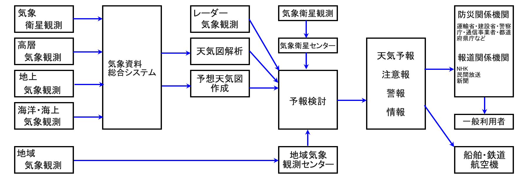 残念ながら窪田先生は1997年にお亡くなりになっておられますが、現代に通じる数値計算に基づいた気象予報の基礎を作られました。 その窪田先生の論文に、気象情報(天気予報)ができるまでを図にしたものがあったのでお借りして載せてみます。