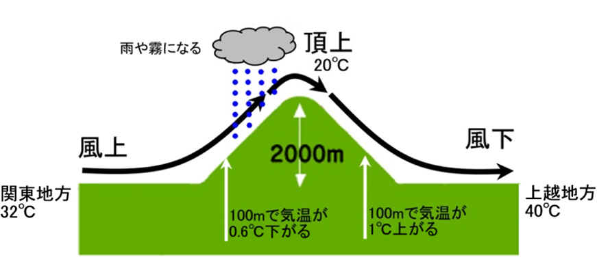 単純に考えれば100mで0.6℃下がるなら谷川岳の頂上付近では0.6x20=12℃の風(空気)になっているはずです。 この空気の気温が下がる時に、空気中に含まれていた水蒸気は集まってきて氷の粒になっていきます。 その同じかわら版( 寒気の到来で上空の大気が不安定 )の時にもお話ししたのですが、これらは「雨雲」になって、氷の粒は地表に落ちるまでに「雨」となって降ってきます。 こうして水蒸気を減らした(湿度の下がった)風が山に沿って吹き降ろしてきます。 風上側と風下側では、空気の湿り具合(湿度)が違いによって、空気が山を登る時と下る時で、気温の上下する割合に変化があり、下る時には100mあたり1℃上がります。 そのため、図のように関東地方で32℃、谷川岳頂上付近で20℃だった風も吹き降ろした時には1℃x20=20℃上昇するため、吹き降ろした地点の上越では40℃という気温になってしまいます。