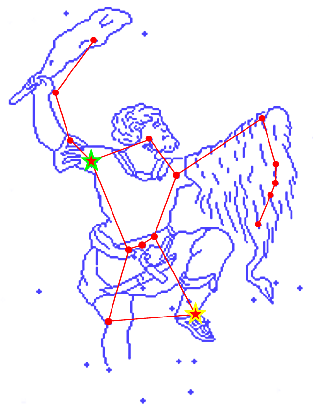 さて、オリオン座の絵を見ると、彼の右肩(胴体の左上)に「ベテルギウス(Betelgeuse)」という、この星座の赤い明るい星があります(もう一つは左かかとの「リゲル」)。