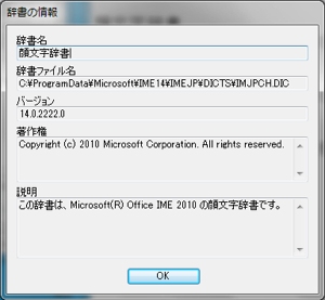 右の画面ではすでに「顔文字辞書」が設定済みのため、「辞書の情報」というボタンから、この辞書の詳細を見てみると、「辞書ファイル名」というところに、