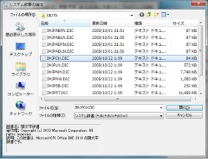 「IMJPCH.DIC」 を選択して「開く」ボタンを押します。 ちなみに人名辞書は「IMJPNM.DIC」、カタカナ辞書(カタカナ→英語に変換)は「IMJPLN.DIC」になります。 |